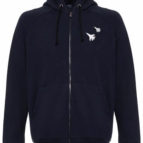 Толстовка синяя с капюшоном на кулиске и молнией спереди. Рукав реглан. Рельефная трикотажная резинка по низу рукавов и нижнему краю. Боковые карманы. Над Спасской башней: Полёты истребителей над центром Москвы — одно из самых ярких воспоминаний от парадов 9 Мая. Дизайнеры Gourji решили его запечатлеть в вышивке новых толстовок. На спине — Спасская башня во всей красе своих ярких цветов, а над ней — четыре белоснежных самолёта. На груди — рифма из двух истребителей, поменьше и побольше. Принимаем заказы на пошив толстовок в размерах от XS до XXL в цветах и дизайнах из ассортимента.ХАРАКТЕРИСТИКИ:Коллекция: Безусловные знакиМатериал: 70% хлопок / 30% полиэстерРазмер: XL