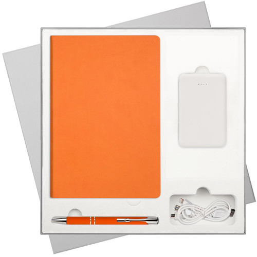 PB19503-100 Внешний аккумулятор, Vogue PB, 5000 mAh, белый кабельLXX1401141-070/1 Ежедневник недатированный, Portobello Trend, Sky, 145х21017BP3207-070 Шариковая ручка Alpha, оранжеваяGIFT-BOX-57-GREY/3 ПОДАРОЧНАЯ КОРОБКА ДЛЯ НАБОРА  СЕРАЯ, 360*295 мм,  c ложементом под Еж-к + ручка + ЗУ Vogue+ кабель
