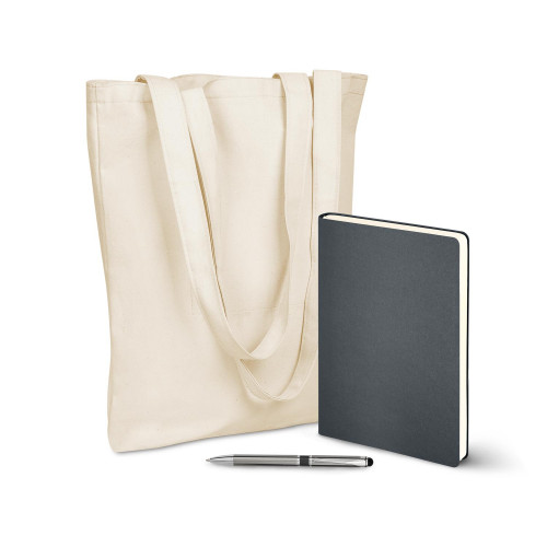 В состав набора входят: 20823.525 - Сумка для покупок Arris, хлопок, 260 г/м2, 36*40*10 cм19281.010.1 - Ежедневник Portobello Trend, Star, недатированный, черный (без упаковки, без стикера)143016.010 - Шариковая ручка iP, черная