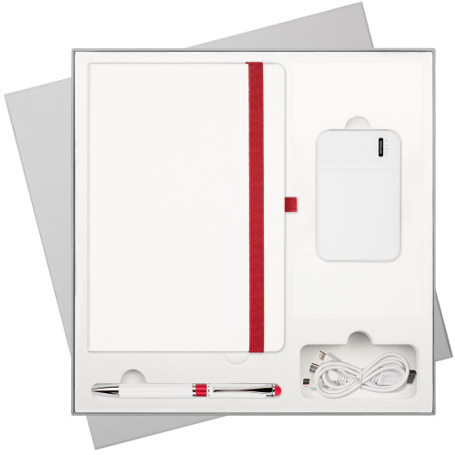 В состав набора входят: GIFT-BOX-34.GREY - ПОДАРОЧНАЯ КОРОБКА ДЛЯ НАБОРА СЕРАЯ, 307*307 мм, светлый ложемент, под съемные ложементы16261.060 - Ежедневник Portobello Trend, Arctic, недатированный, белый/красный163016.100.060 - Шариковая ручка Arctic, белая/красная37220.100 - Внешний аккумулятор с подсветкой, Skyline, 5000 mAh, белый